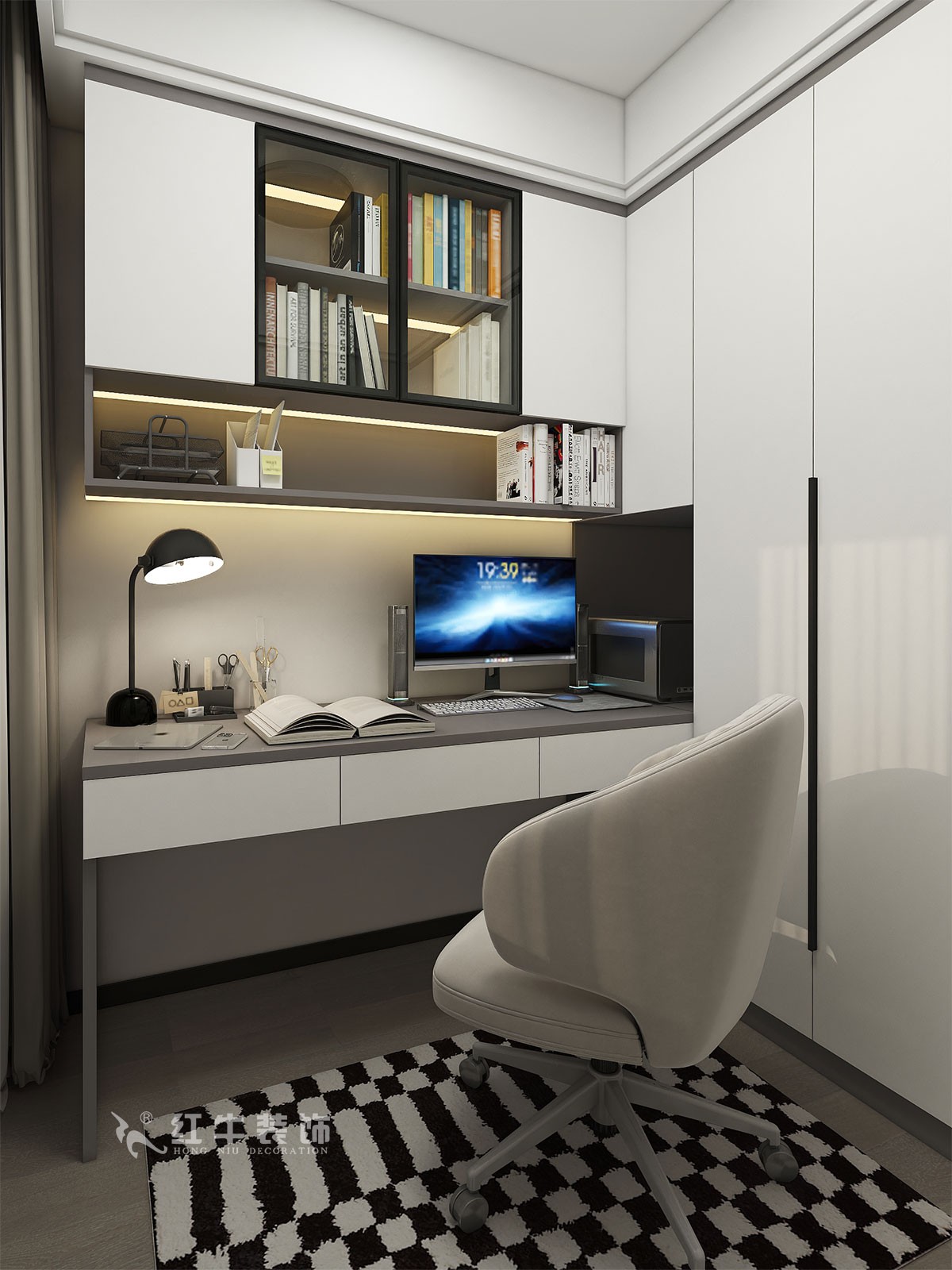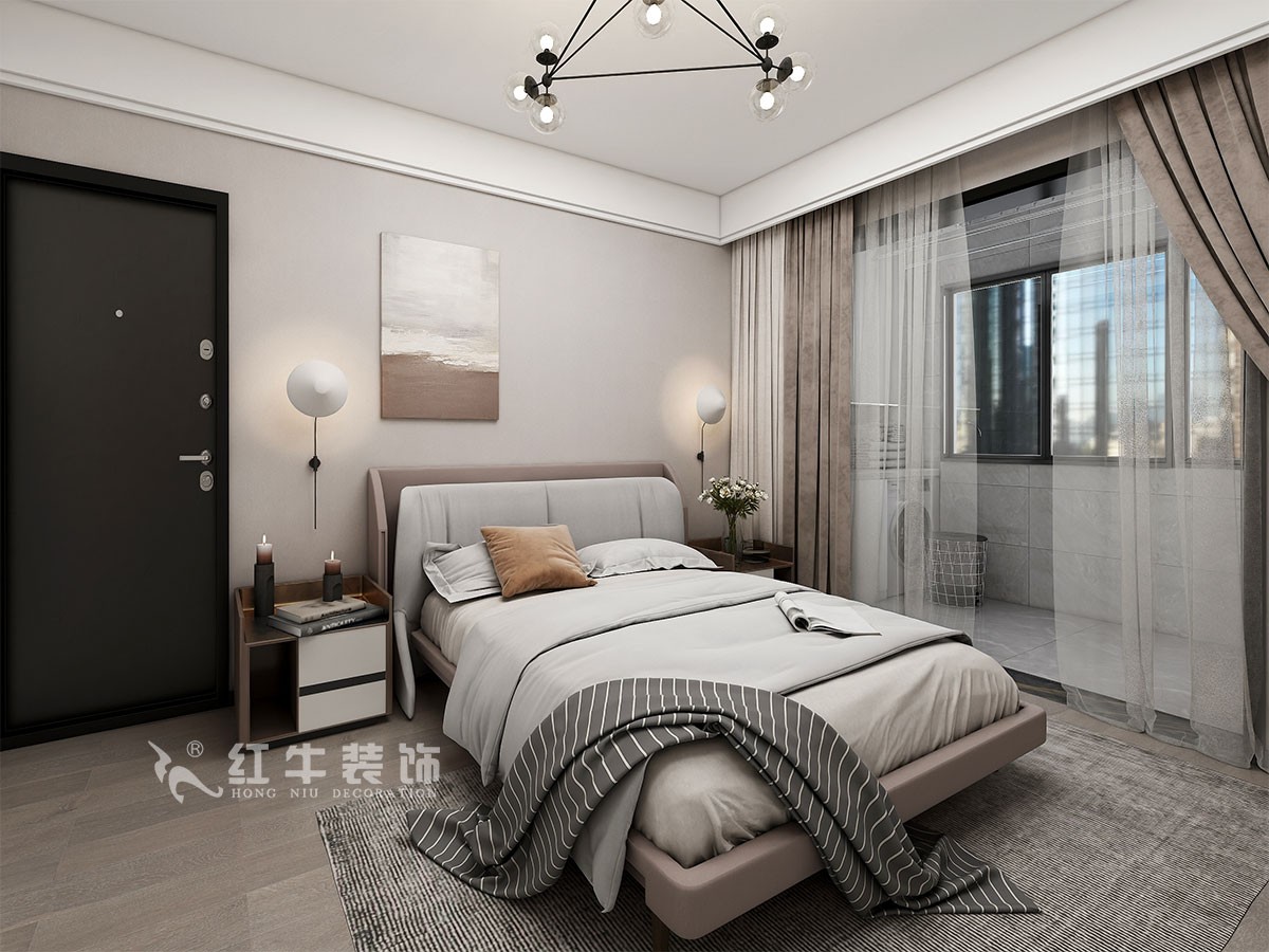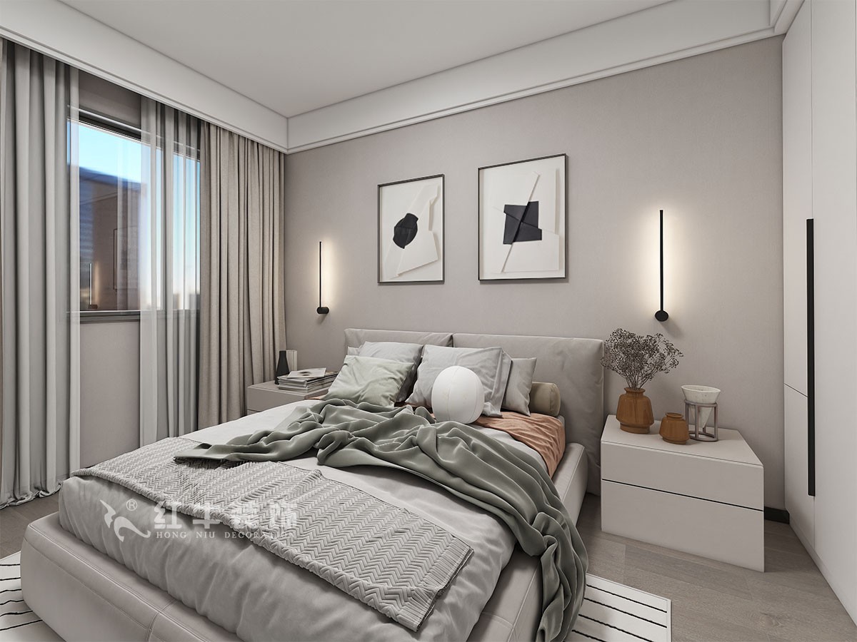 此案主要是婚房居住,在舒適度上要求比較高,臥室是整套房子中最私人也是最體現(xiàn)出溫馨休閑感的空間,在設計時體現(xiàn)出靜謐舒適的感覺,并且與其他空間明顯的區(qū)別,利用書房厚度開洞口,把電視掛墻上,把冰箱嵌入,更好的布局。這樣舒適度更好,區(qū)域劃分明顯,動靜分離。吊頂簡潔大氣,配以輕現(xiàn)代家具,完美闡釋了簡約風格。整體現(xiàn)代簡約風格的設計,搭配上顯眼的綠色植物讓整個空間呈現(xiàn)出一種生機勃勃的自然美。