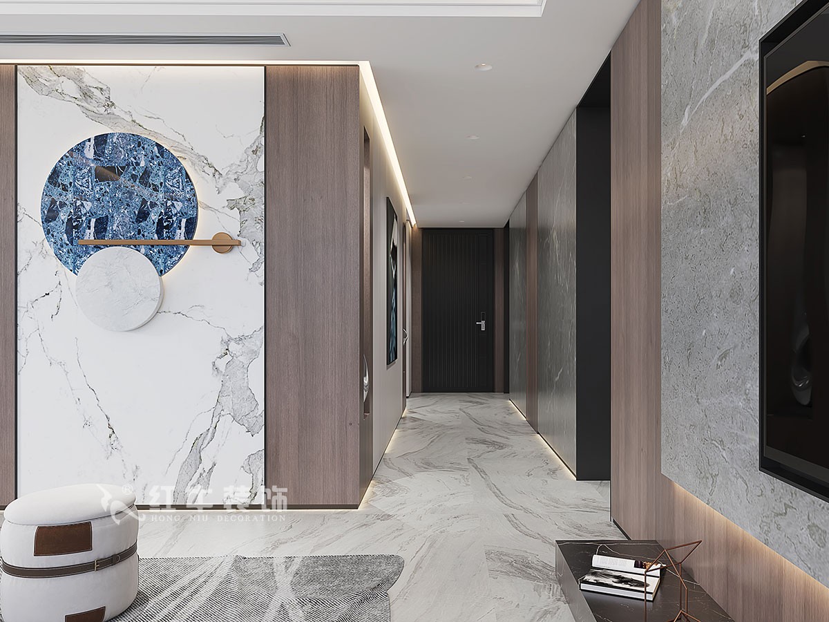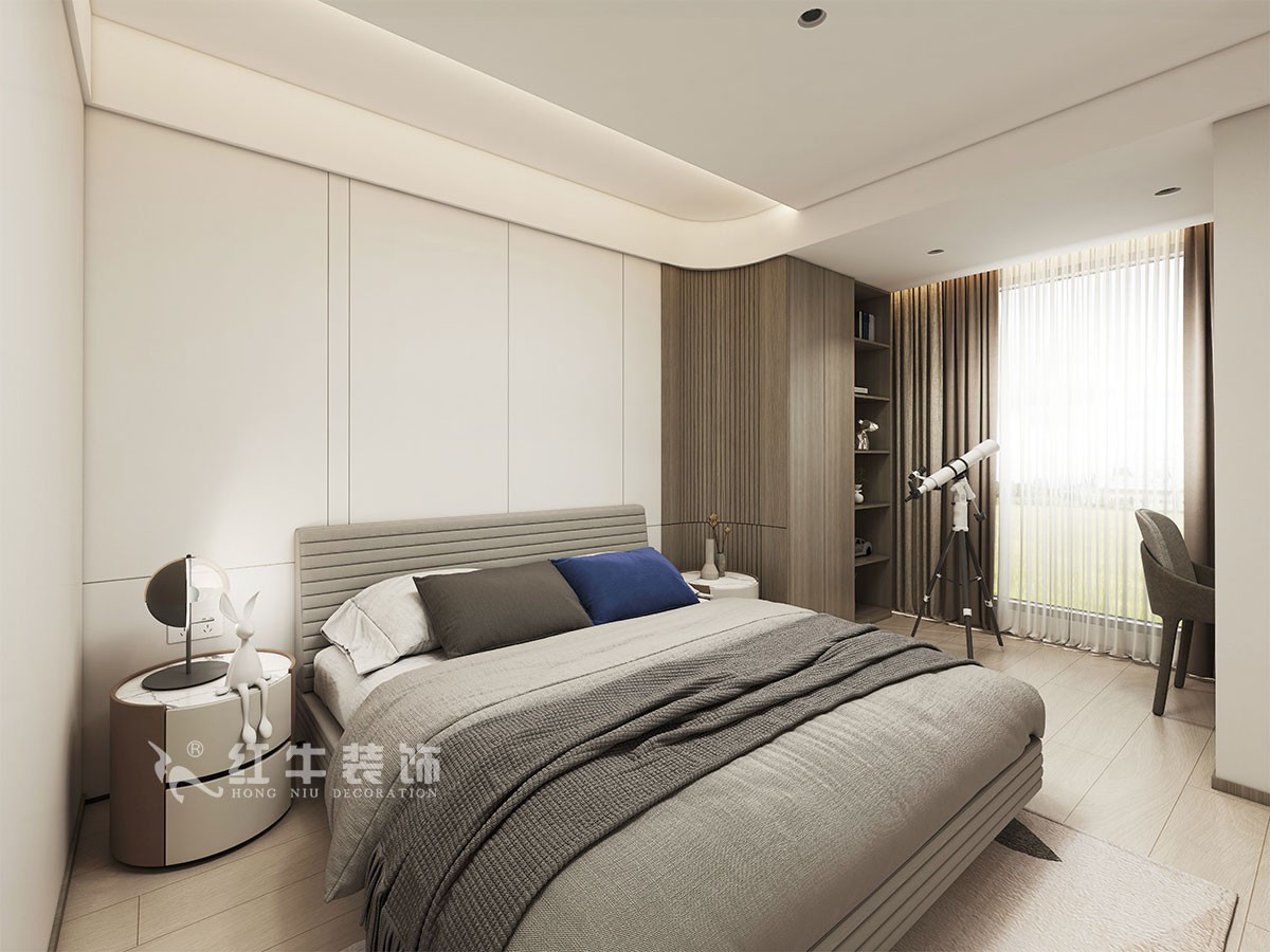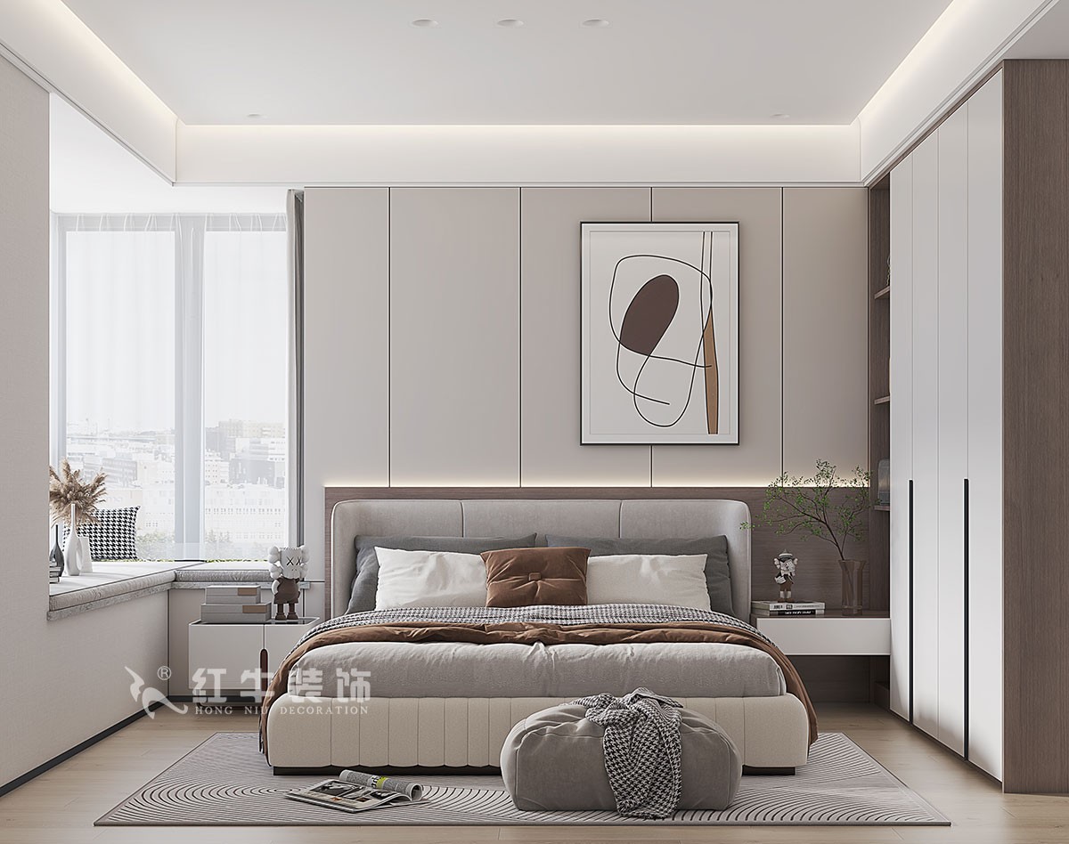 4、整體風(fēng)格現(xiàn)代輕奢,餐廳墻面的裝飾面板窗簾槽,和酒柜顏色統(tǒng)一,懸浮吊頂?shù)脑O(shè)計(jì),淺灰色的石材地面,墻深地淺的設(shè)計(jì),讓整個(gè)空間看上去沉穩(wěn)中不失時(shí)尚。客廳電視背景墻整體石材+裝飾面板護(hù)墻,電視機(jī)柜采用石材地臺(tái)形式,板簡(jiǎn)潔沉穩(wěn)過(guò)道墻面和電視背景墻形成整體,石材和裝飾面板搭配,另外一面是兩個(gè)儲(chǔ)藏室的門(mén),均采用“電動(dòng)巴士”門(mén)的設(shè)計(jì),因?yàn)檫^(guò)道比較長(zhǎng),墻面上的兩個(gè)壁龕和內(nèi)嵌裝飾畫(huà),完美的解決了這個(gè)問(wèn)題。主臥室L形的飄窗,搭配灰色的飄窗軟墊,讓整個(gè)空間更有柔性的美,臥室的背景墻也和柜子形成了一體,床頭柜直接從柜子中延伸出,上方開(kāi)放式個(gè)隔層,方便房屋主人擺放一些書(shū)籍和裝飾品。