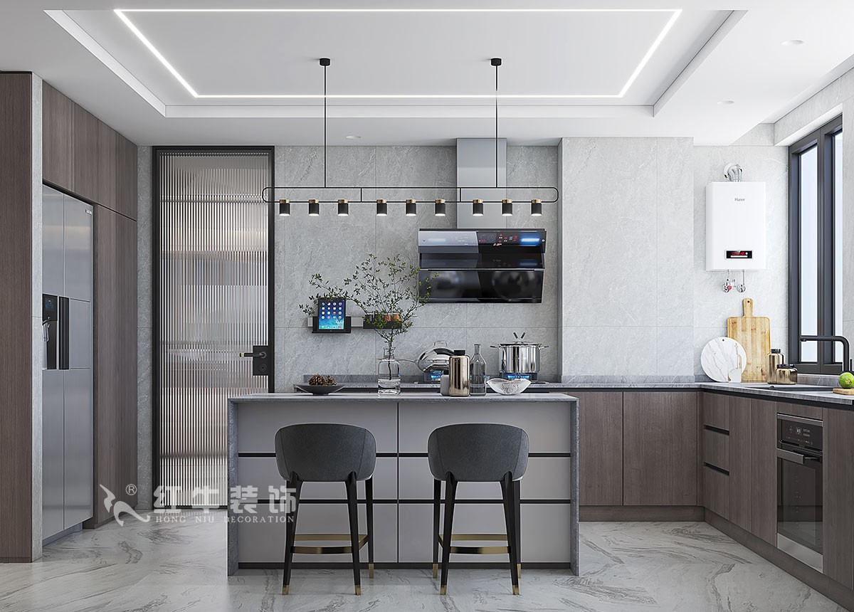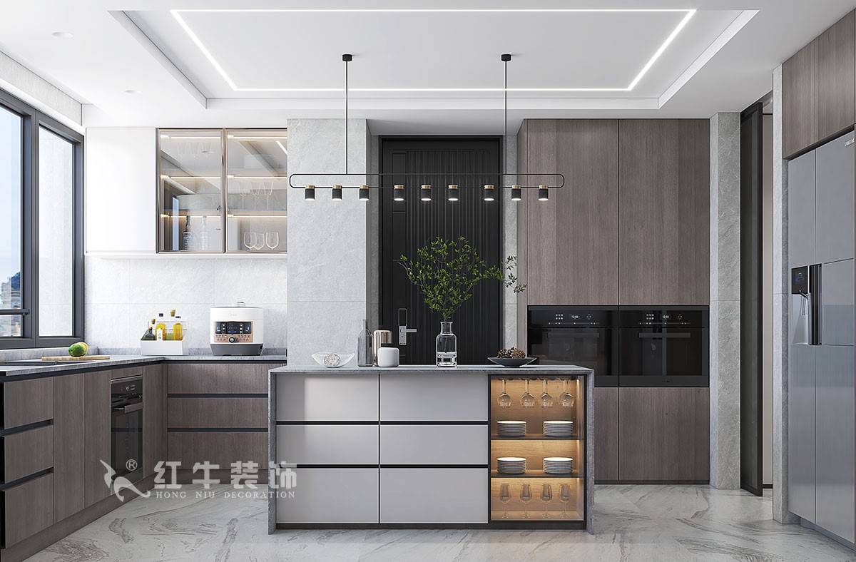 2、超大的廚房有19.2平方,廚房櫥柜設(shè)計(jì)成G字形。操作使用方便,吧臺(tái)的設(shè)計(jì)增加了家人之間的互動(dòng),同時(shí)也可以再餐廳完成簡(jiǎn)餐。