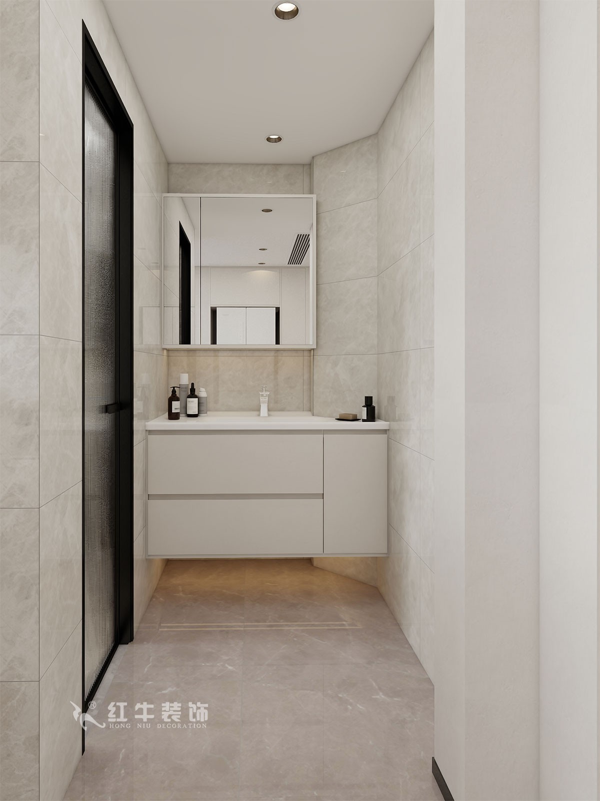 衛(wèi)生間原先門洞對著臥室門,客戶忌諱,進行了調(diào)整,做成了餐邊柜,同時衛(wèi)生間做成了干濕分開。