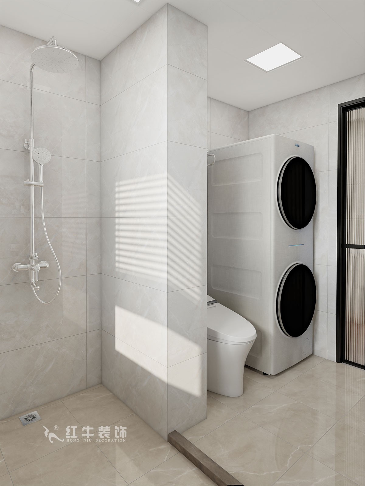 房子平時兩個人居住,但是考慮老人小孩可能會過來住,衛(wèi)生間利用率太低了,同時考慮人多的時候使用問題,設(shè)計的時候把北陽臺利用進來。