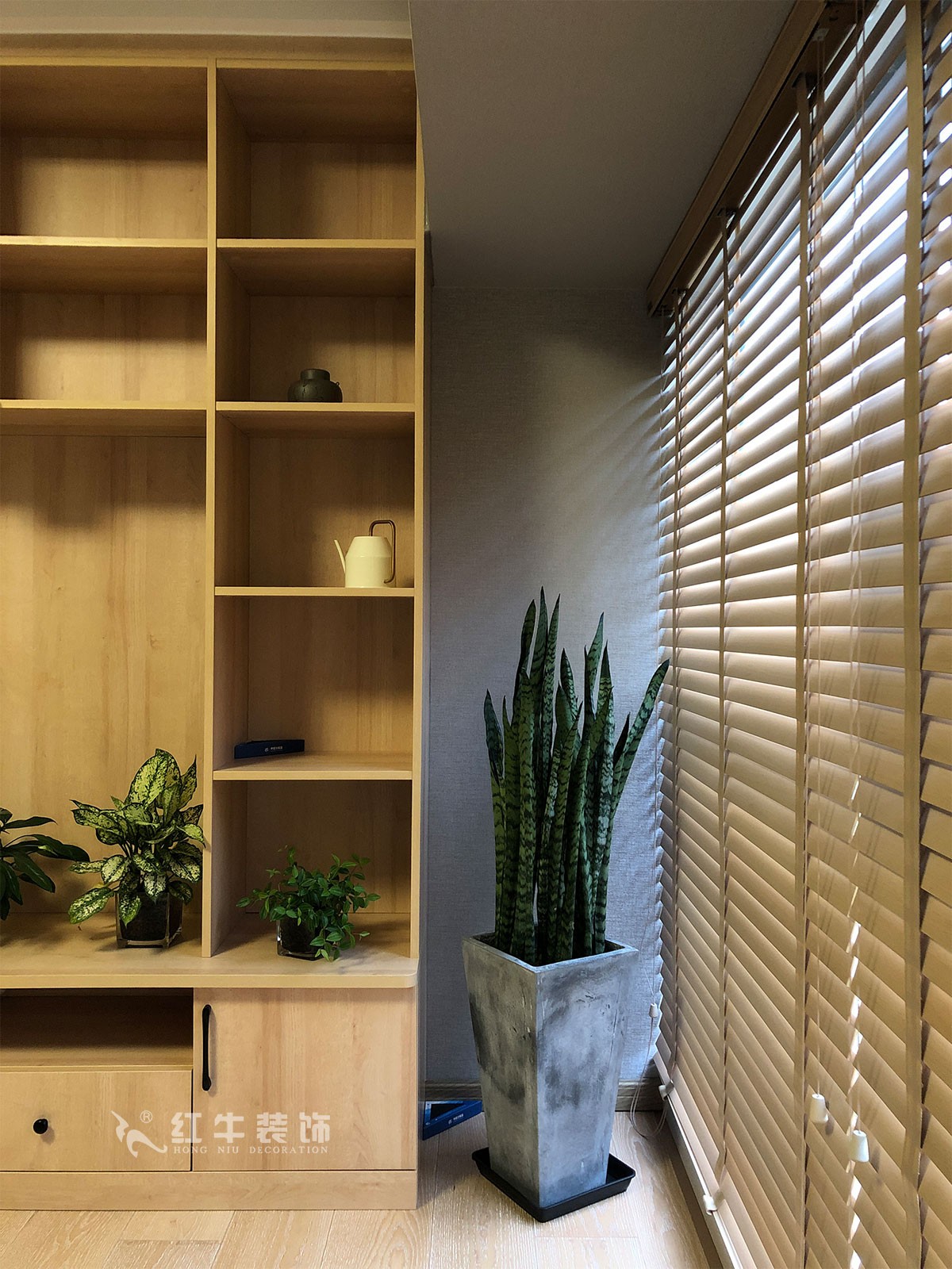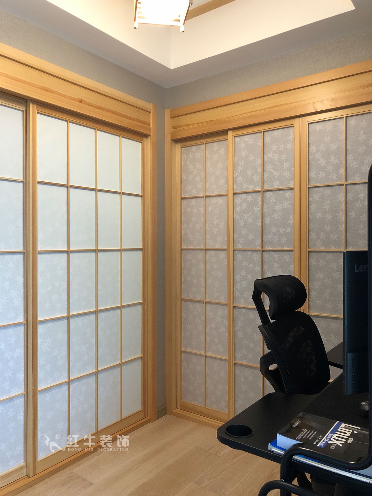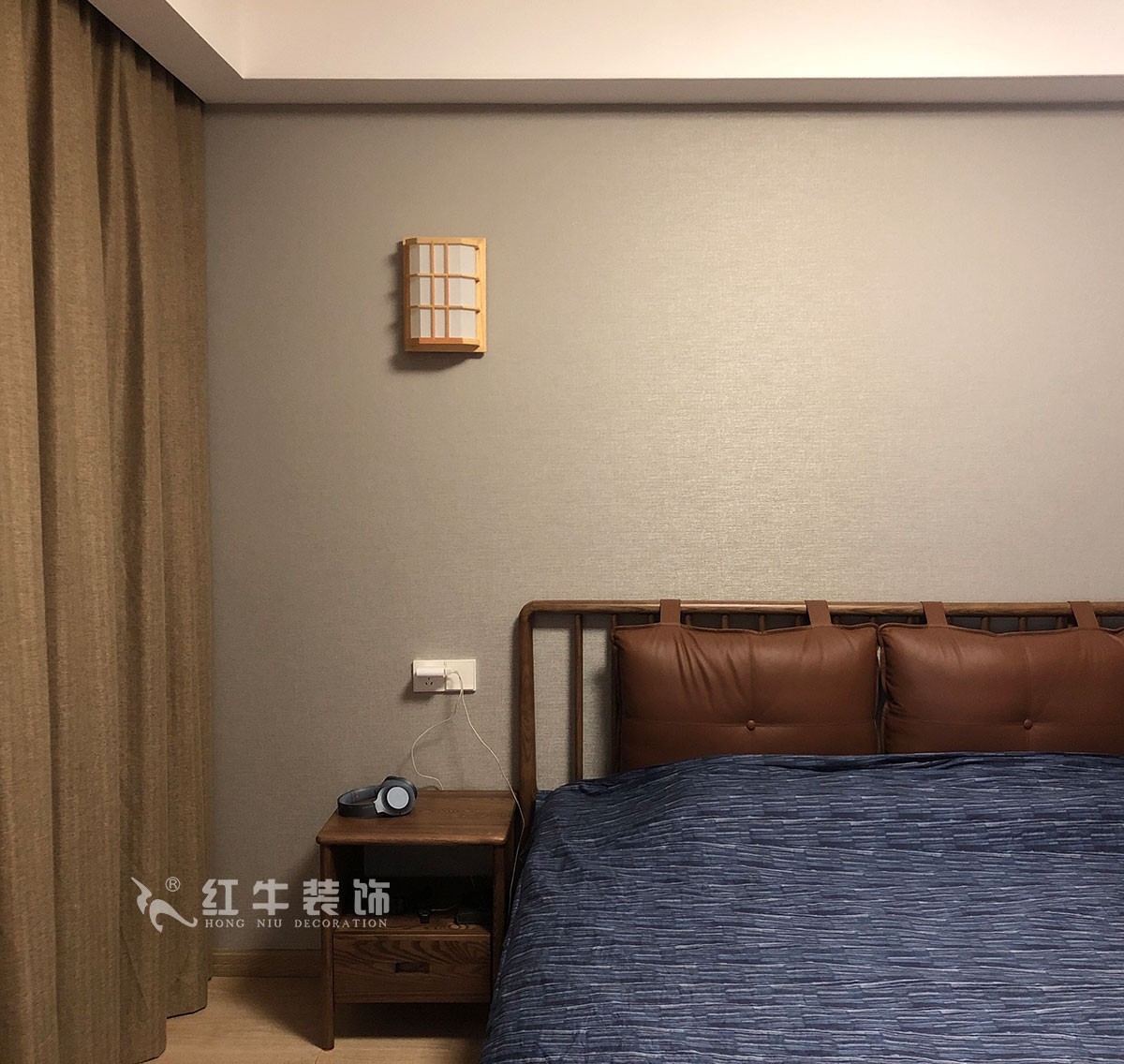 客餐廳色調(diào)清雅,休閑、隨性,又不失精致。電視背景墻依靠大面積開放柜拓展儲物及裝飾功能,給居住者一個慵懶、明快的起居環(huán)境。臥室,依靠木質(zhì)家具本身的線條感,搭配同樣風格的日式壁燈,給人以休閑自在的視覺感受。書房是辦公空間,整面墻全部以臥室同色的麻灰色墻布鋪貼,書桌旁轉角的飄窗給了原本不大的空間一個視覺的開放性,心情也自然就舒緩很多。