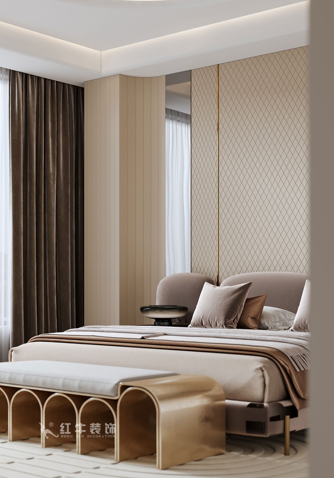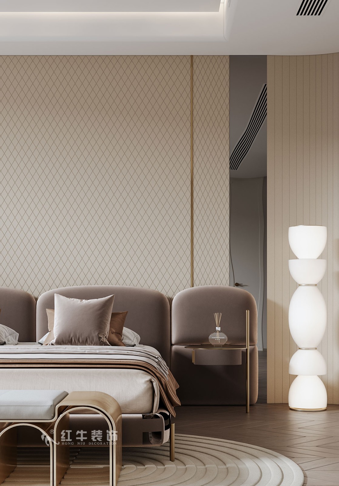 主臥的設(shè)計(jì)上,用簡(jiǎn)單的屏風(fēng)設(shè)計(jì)分割出衣帽間,休閑區(qū)等功能分區(qū),但是在視覺(jué)上并不會(huì)顯得擁擠。整體的吊頂進(jìn)行改動(dòng),增加設(shè)計(jì)風(fēng)格的體現(xiàn),無(wú)主燈的設(shè)計(jì)滿足各個(gè)空間的照明需求,也讓空間更加簡(jiǎn)潔明亮。