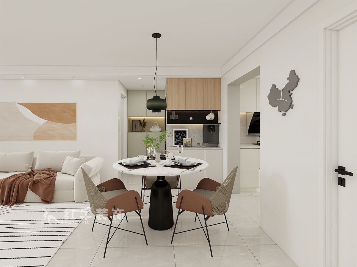 餐廳說明:餐邊柜擴(kuò)充了廚房儲(chǔ)物的不足,也提升了適合夫妻的生活質(zhì)量。