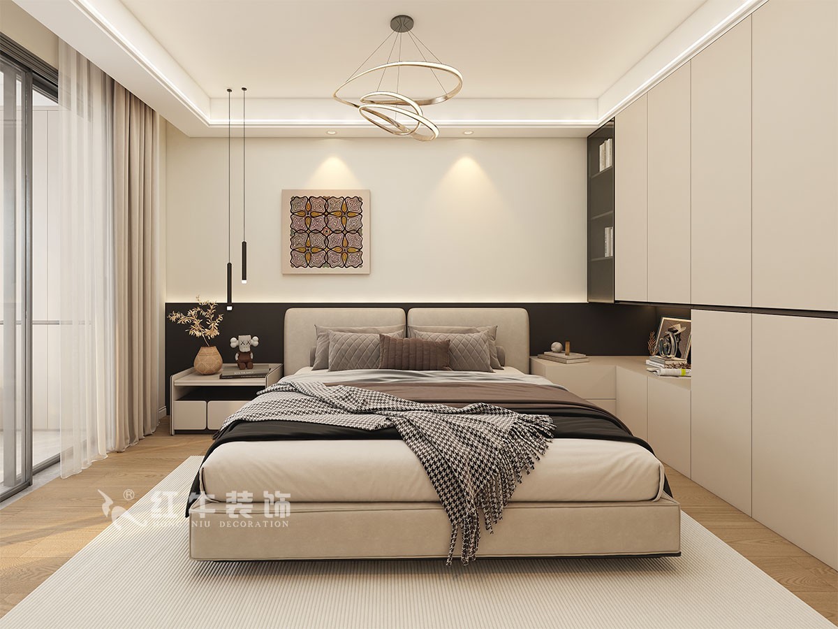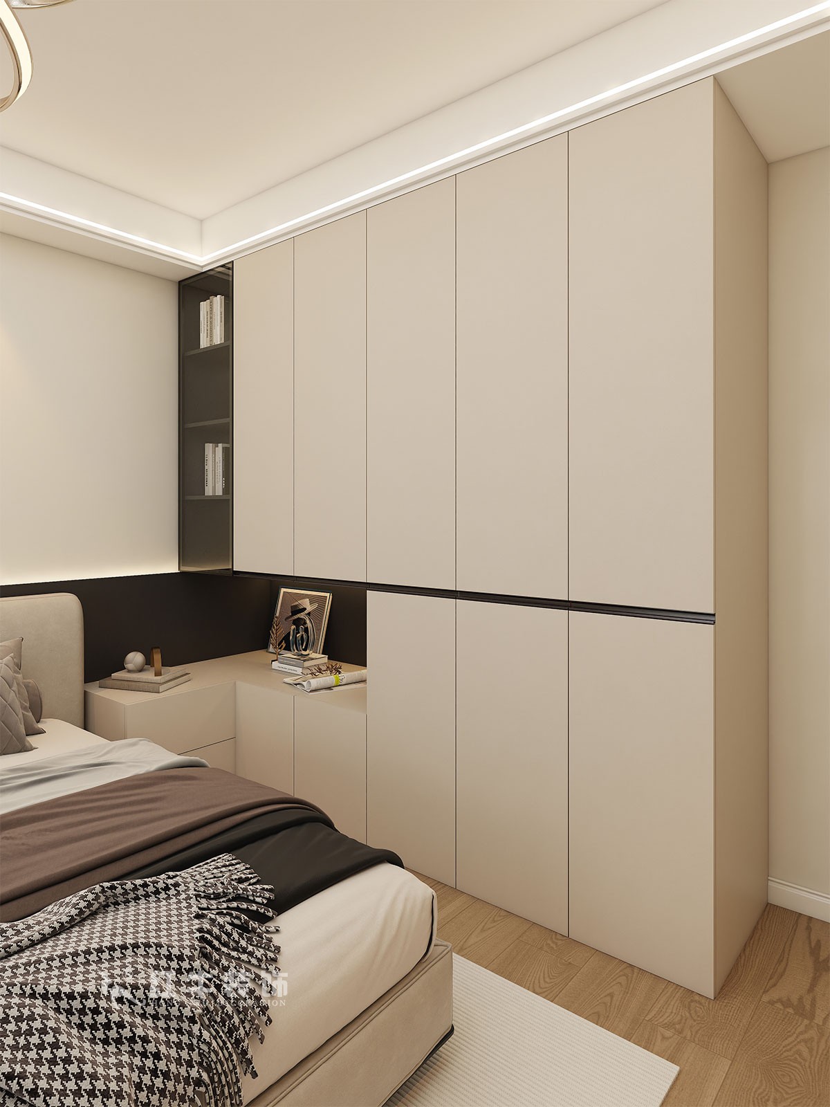 本案設(shè)計墻面用的是白色乳膠漆,讓空間更加溫馨,吊頂層高做高點,燈光設(shè)計講究空間的柔和,著重點光源的點綴,讓家更加的明亮溫馨。