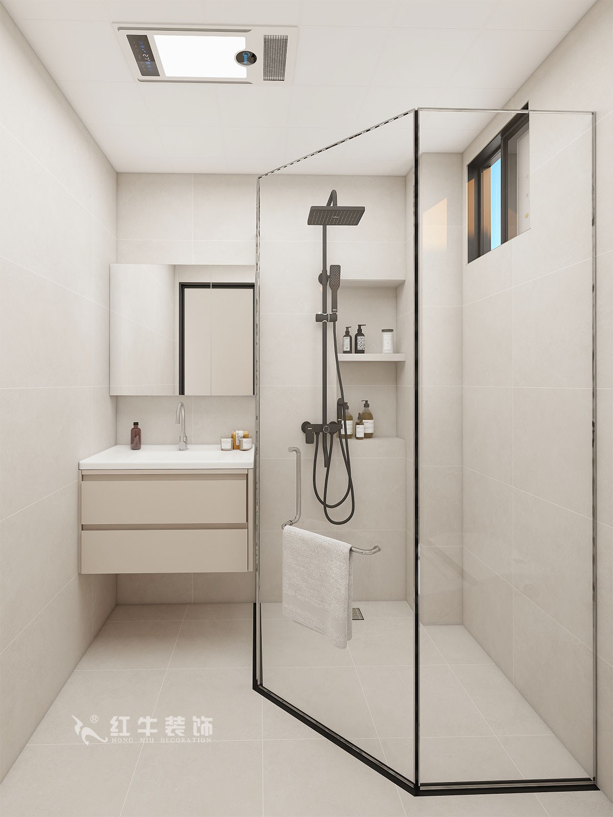 衛(wèi)生間說明:選擇整體色彩搭配干凈、大方,選擇大尺寸淺灰色瓷磚上墻,氛圍感溫馨感滿滿。