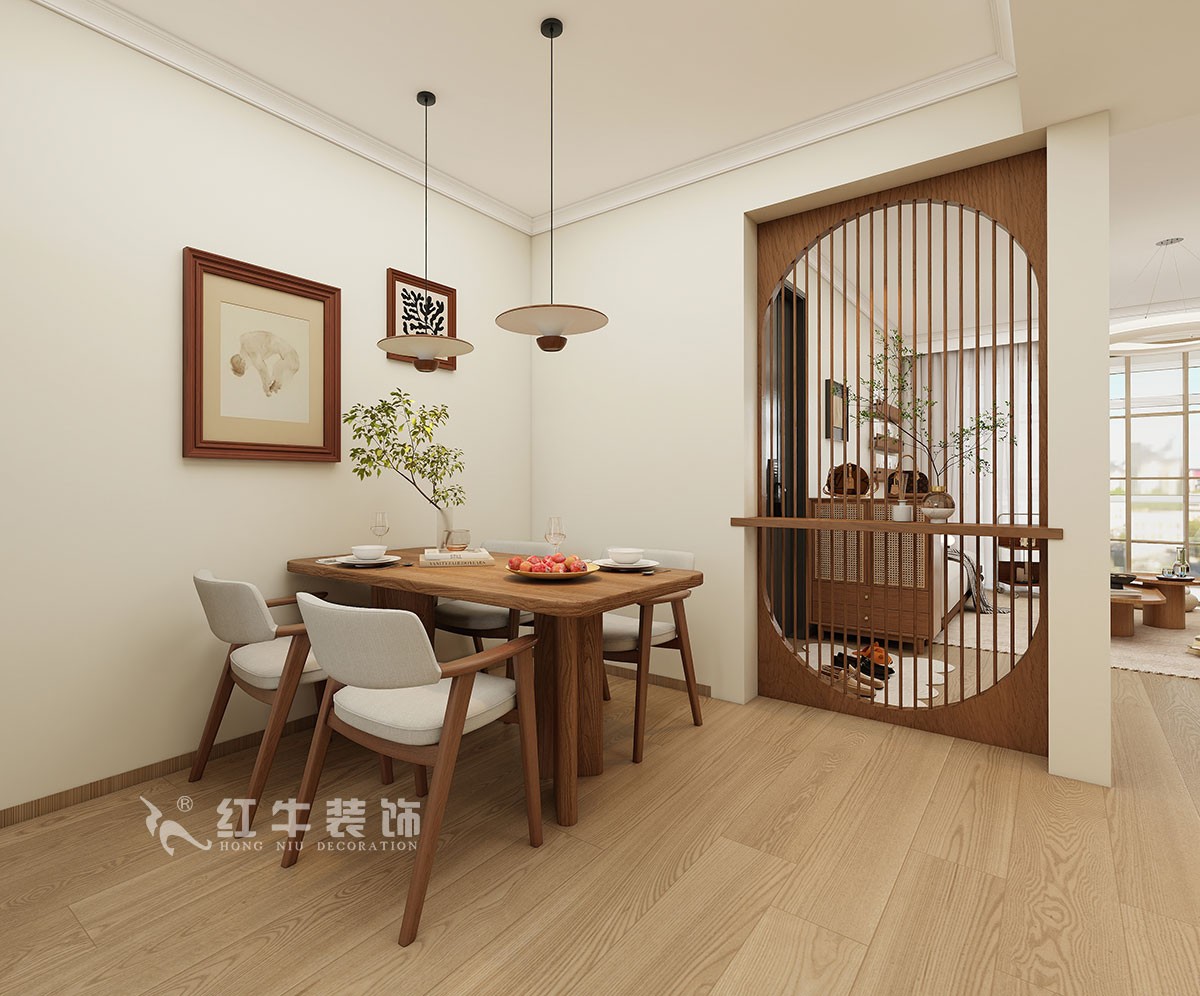 入戶門廳增加鞋柜,增加入戶儲藏客廳的搭配以定制的原木收納柜為主,格局之內都采用天然木質家具,最柔和的顏色,最真實的紋理,搭配球形吊燈,打造出舒適優(yōu)雅的就餐環(huán)境。