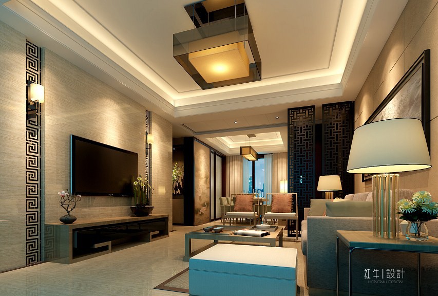 現(xiàn)代風(fēng)格的家具表明了整個(gè)空間的基調(diào),中式風(fēng)格的紋路組合使空間不至于太過(guò)呆板,添加了一絲俏皮的因素,偌大的花格燈成為視覺(jué)中的一大亮點(diǎn)。