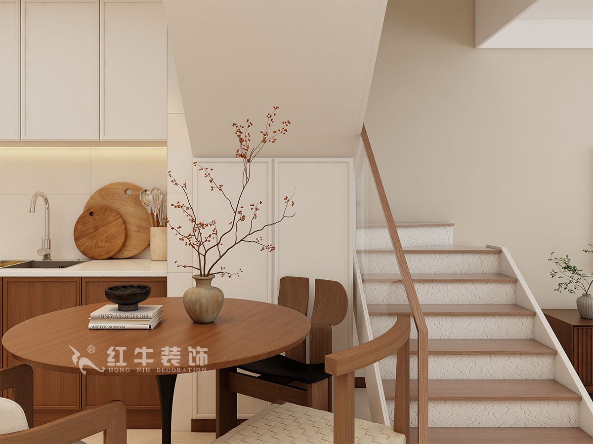 細(xì)節(jié)設(shè)計:樓梯扶手與層板采用胡桃木色,串聯(lián)上下空間;軟裝以棉麻布藝為主,輔以少量金屬元素(如黑鋼燈具)提升精致感。綠植點(diǎn)綴增添生機(jī),強(qiáng)化自然氛圍。