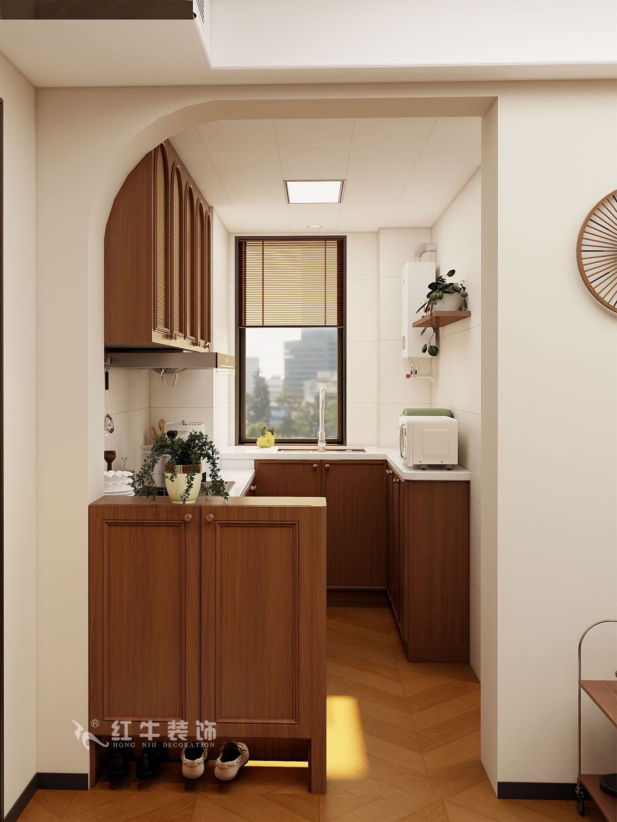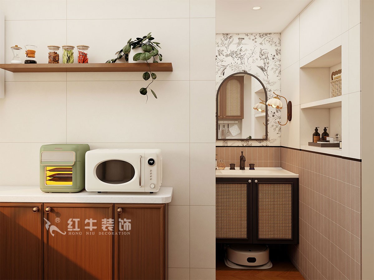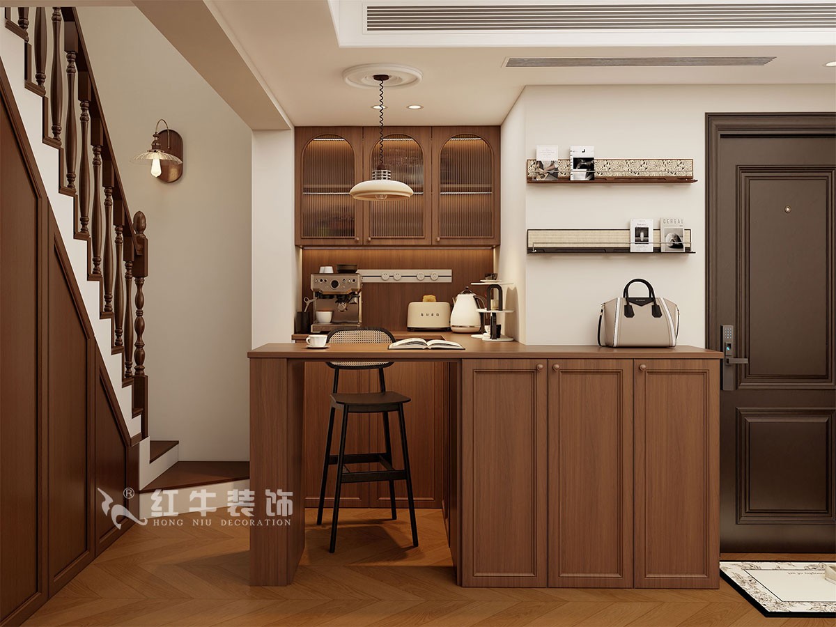 主要解決的是收納的功能,做了去客廳化的設(shè)計(jì),在樓梯拐角做了一個(gè)吧臺(tái)區(qū),兩個(gè)區(qū)域來(lái)分解餐廳的功能,同時(shí)又增加了家庭氛圍。房間還是以實(shí)用和增加收納功能為主。