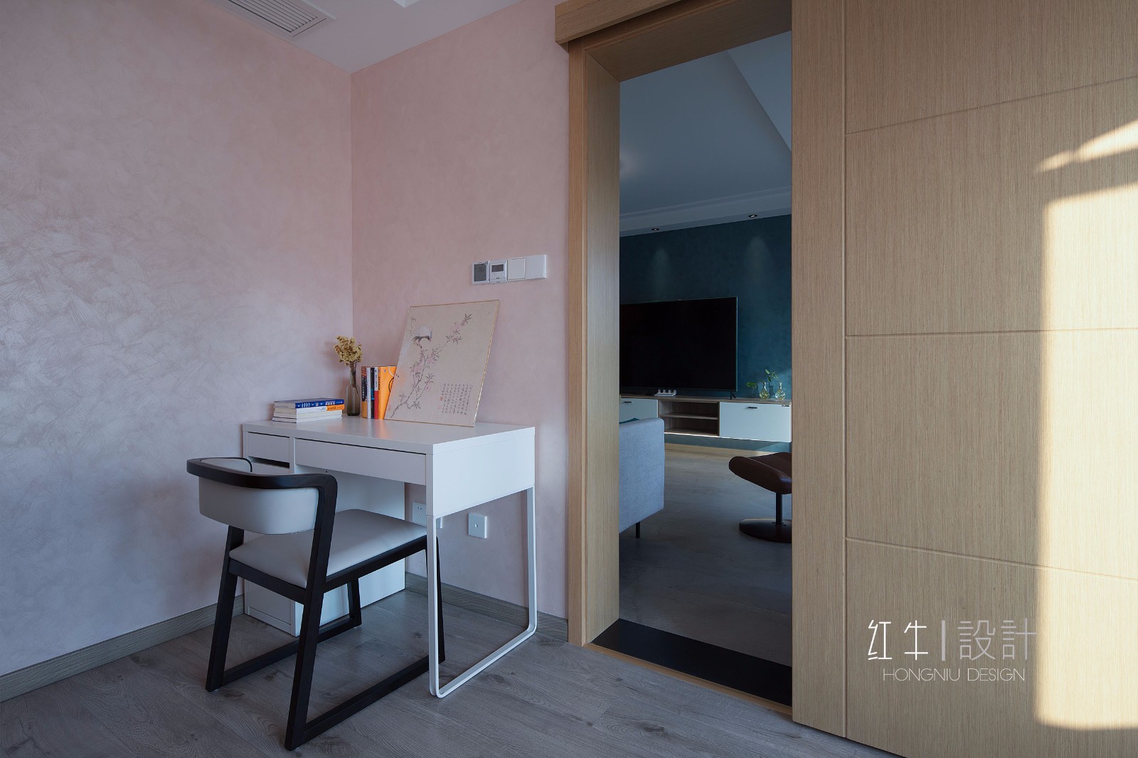 客廳的后方,就是一個書房,低飽和度的粉色墻壁,顯得非常柔美。