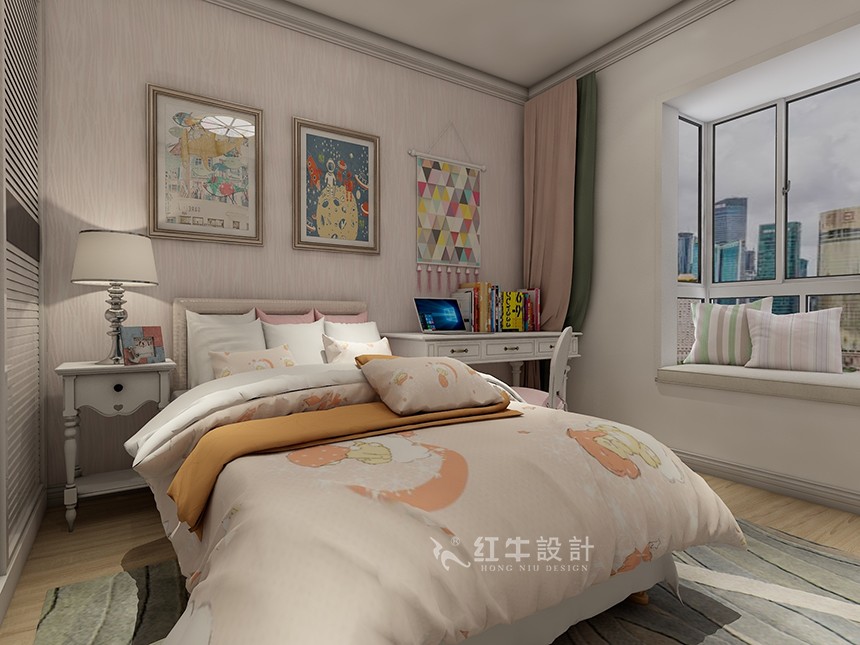 粉色的墻面,搭配充滿活力的裝飾畫,淡雅清新的床品,給人一種溫暖舒適的感受,是兒童房這個空間該有的詮釋。