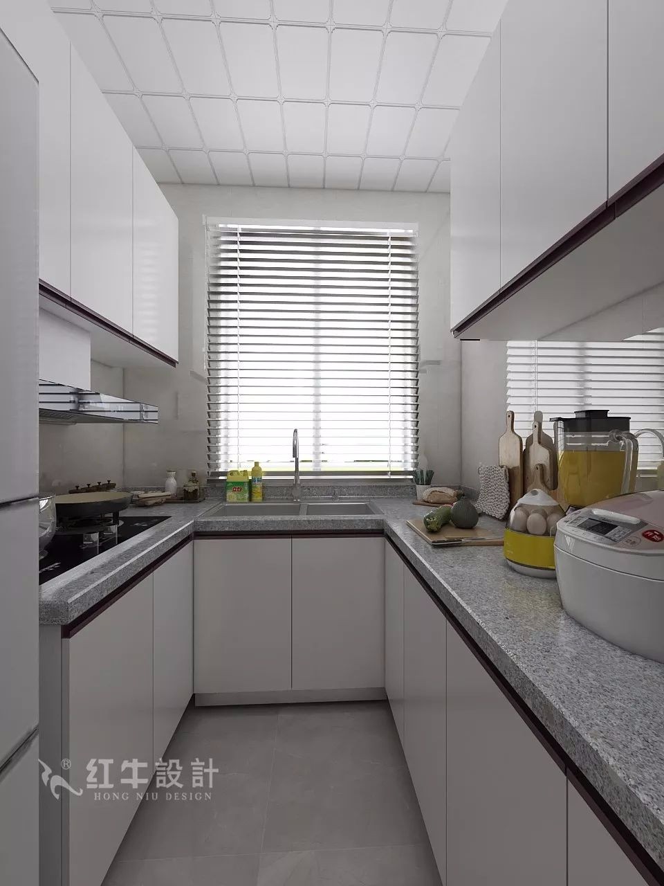 緊湊的U型廚房,存儲(chǔ)空間充足,烹調(diào)操作便利,全白的烤瓷面櫥柜讓廚房顯得清爽大方。