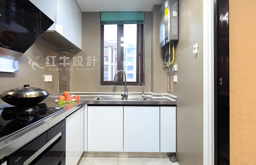 黑色和白色帶來醒目的對比,搭配灰色墻面展現(xiàn)出現(xiàn)代感。吊柜擁有強勁的收納功能,油煙機嵌在吊柜里面,顯得整潔美觀。廚房安裝了雙水槽,可以分類清洗,使用起來很方便。