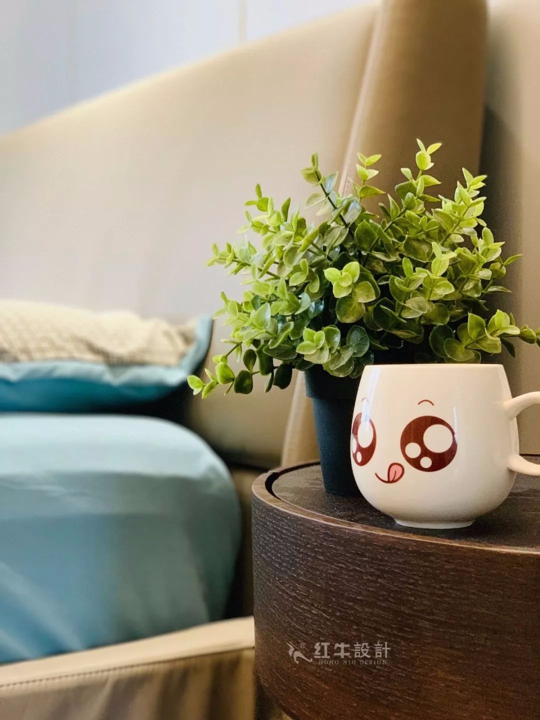 床側(cè)擺放圓形床頭柜,上面放著清新的綠植,帶來(lái)清新自然的空間氛圍。