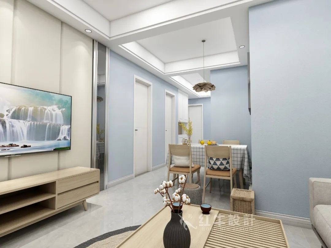 因為把整個墻體往前拉平了,為了不讓整個空間顯得擁擠,所以在進門的盡頭設(shè)計了一個端景柜,增加層次感和空間進深感。