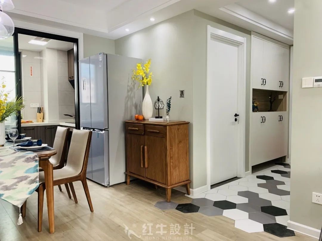 入戶門廳,一側(cè)是嵌入式木質(zhì)玄關(guān)柜,底部留空可以放置鞋子。地面拼貼了六邊形地磚,由黑白灰三色組成,流暢又清爽。