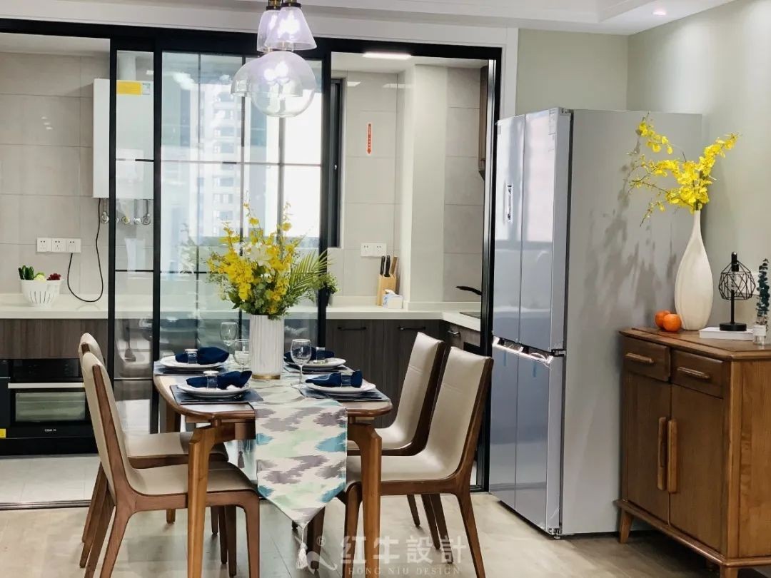 玻璃推拉門讓餐廚空間顯得更加寬敞,也便于光線導(dǎo)入餐廳,使得室內(nèi)采光更好。