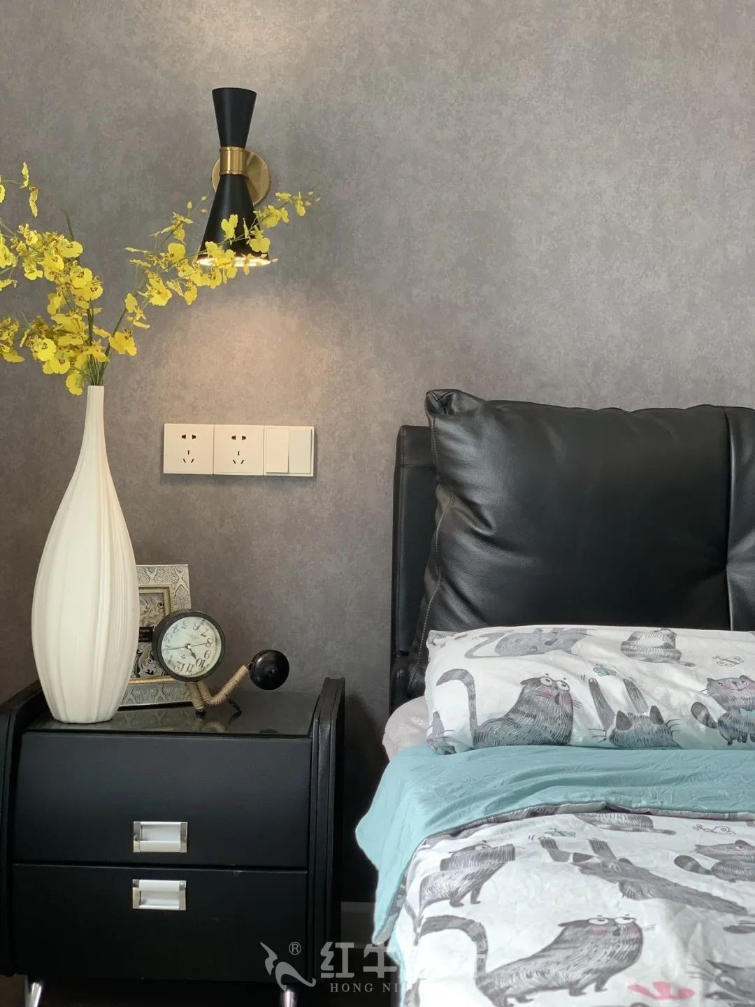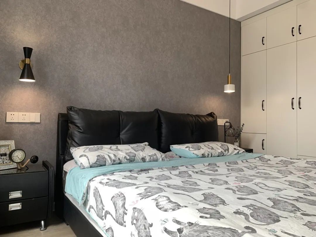 灰色背景下的黑色床品,看起來頗有時(shí)尚感。床頭兩側(cè)不同類型的燈具對(duì)比,增加空間靈動(dòng)性,營造出別致優(yōu)雅的燈光環(huán)境。