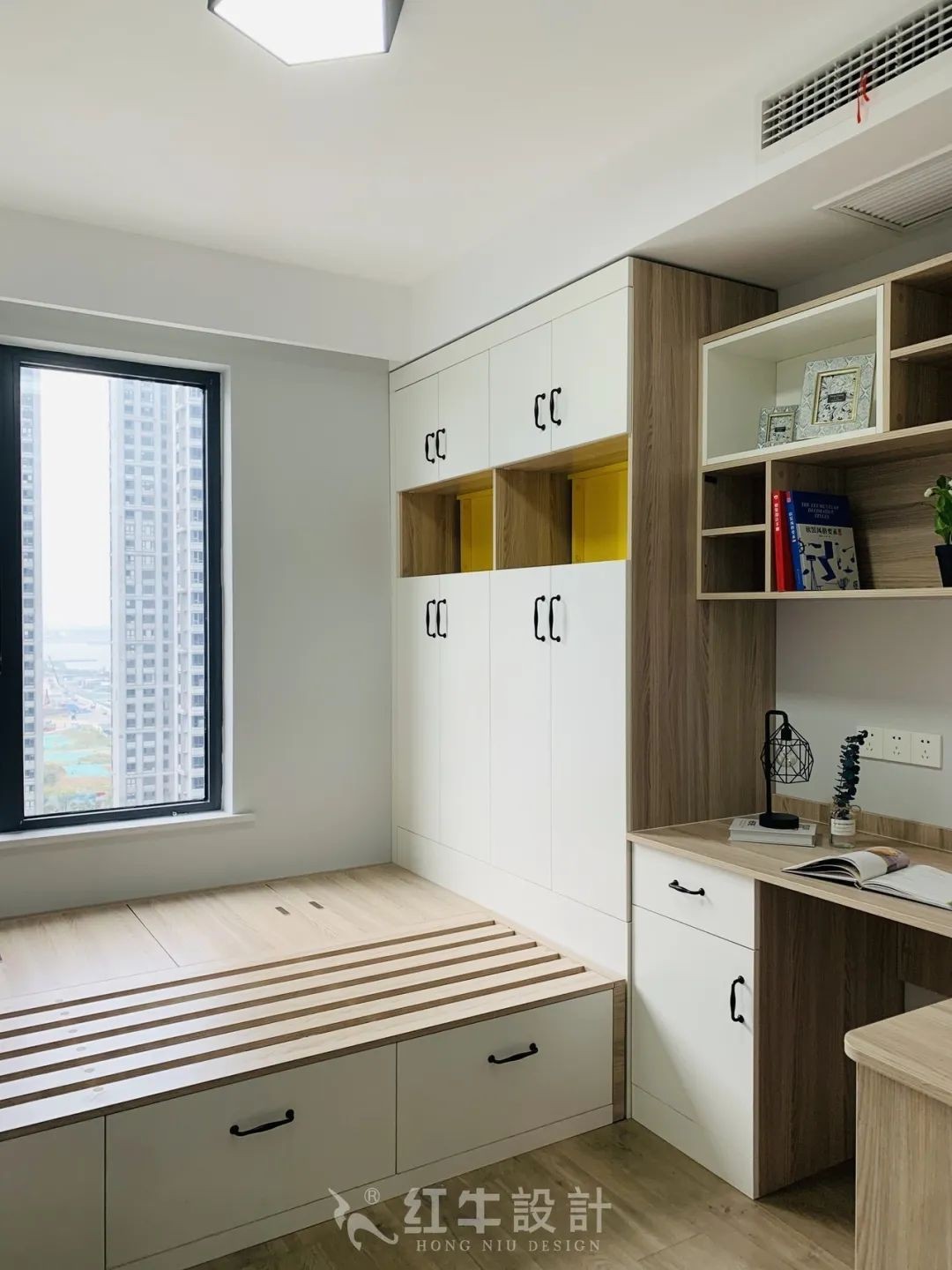 榻榻米床體的線條平整流暢,還專門整合設(shè)計(jì)了櫥柜、書桌等,集多功能于一身,空間利用率極高。