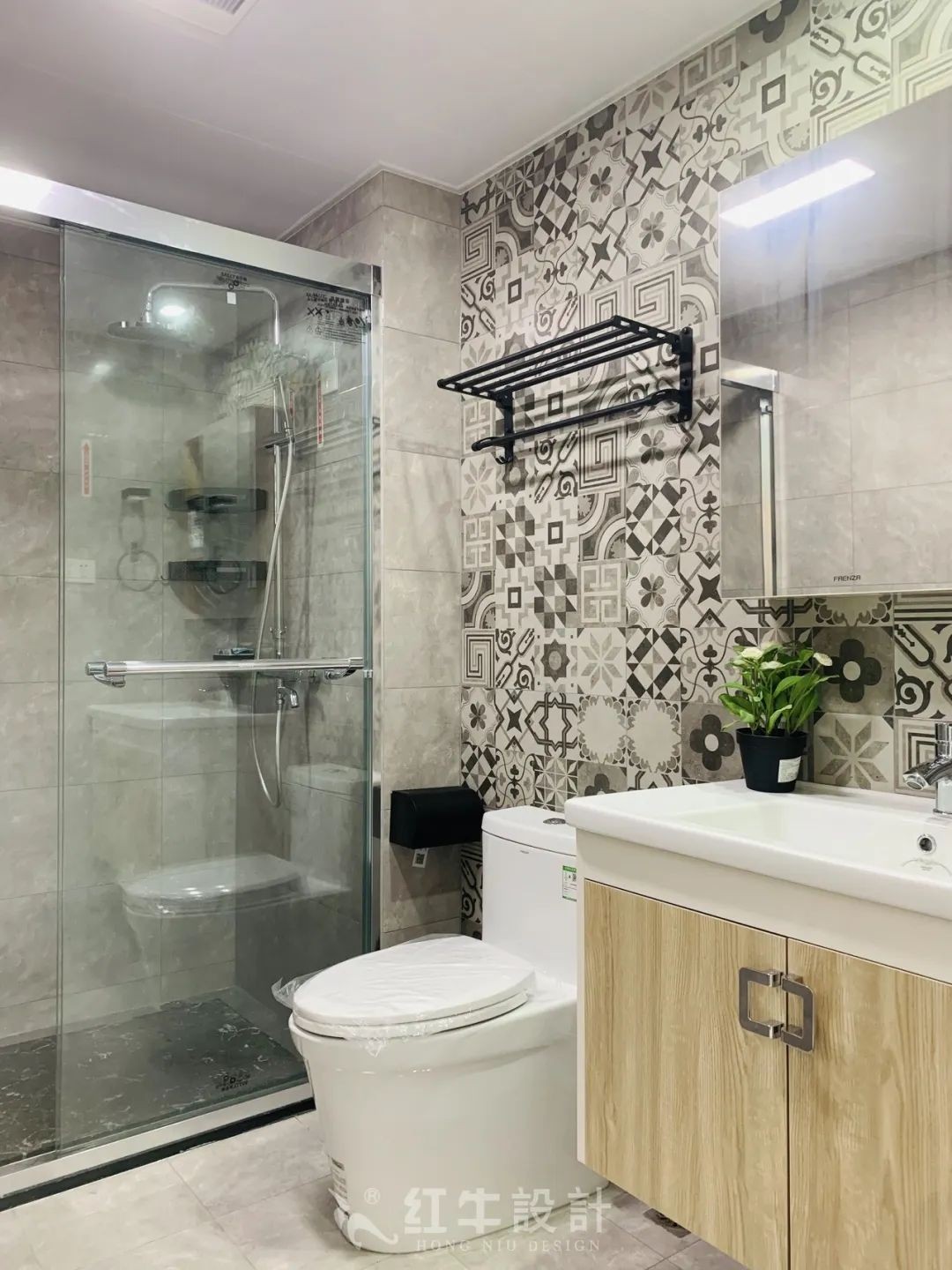 花磚背景墻的設(shè)計(jì),增添了空間趣味。一體盆沒有衛(wèi)生清潔的死角,確實(shí)非常實(shí)用。