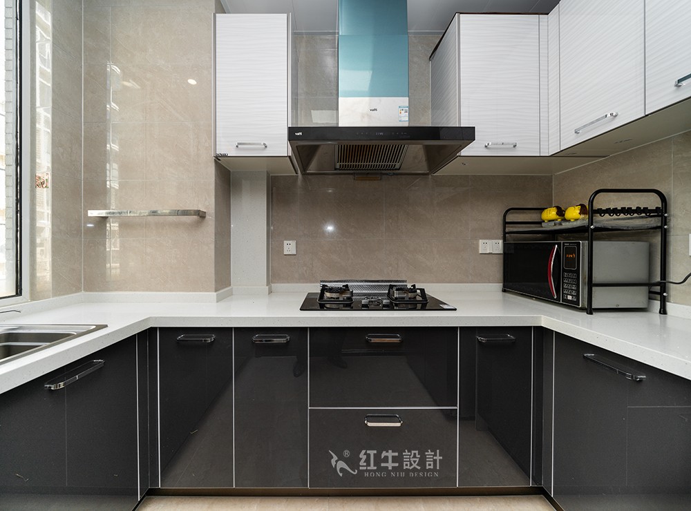 廚房頂部是白色吊柜,底部是黑色亮面櫥柜,而位于中間的墻壁顏色則介于這兩者之間,作為上下的調和與過度,這樣上輕下重的顏色設計,顯得非常和諧。
