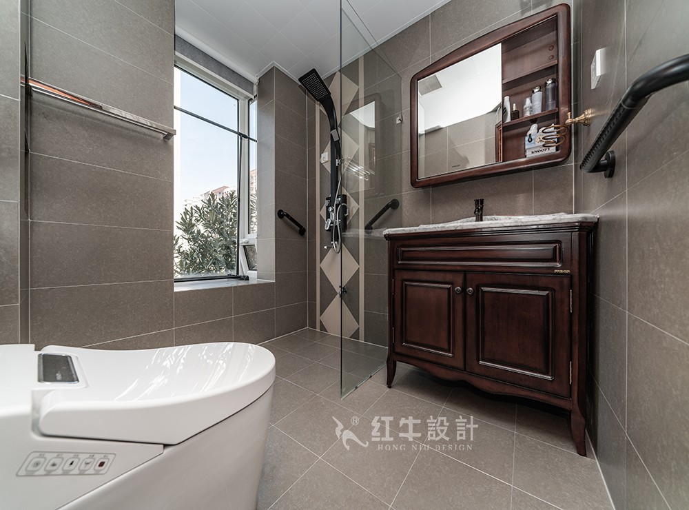 主臥的淋浴部分選擇了半隔斷設計,只要遮擋住花灑,保留一平米的遮擋位置,同樣能阻擋水漬外濺,這樣的設計簡潔大方,使得衛(wèi)生間看起來更寬敞通透。