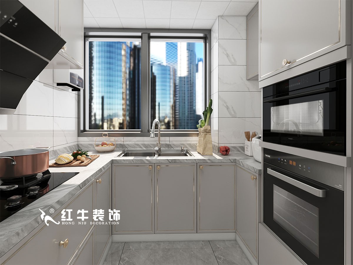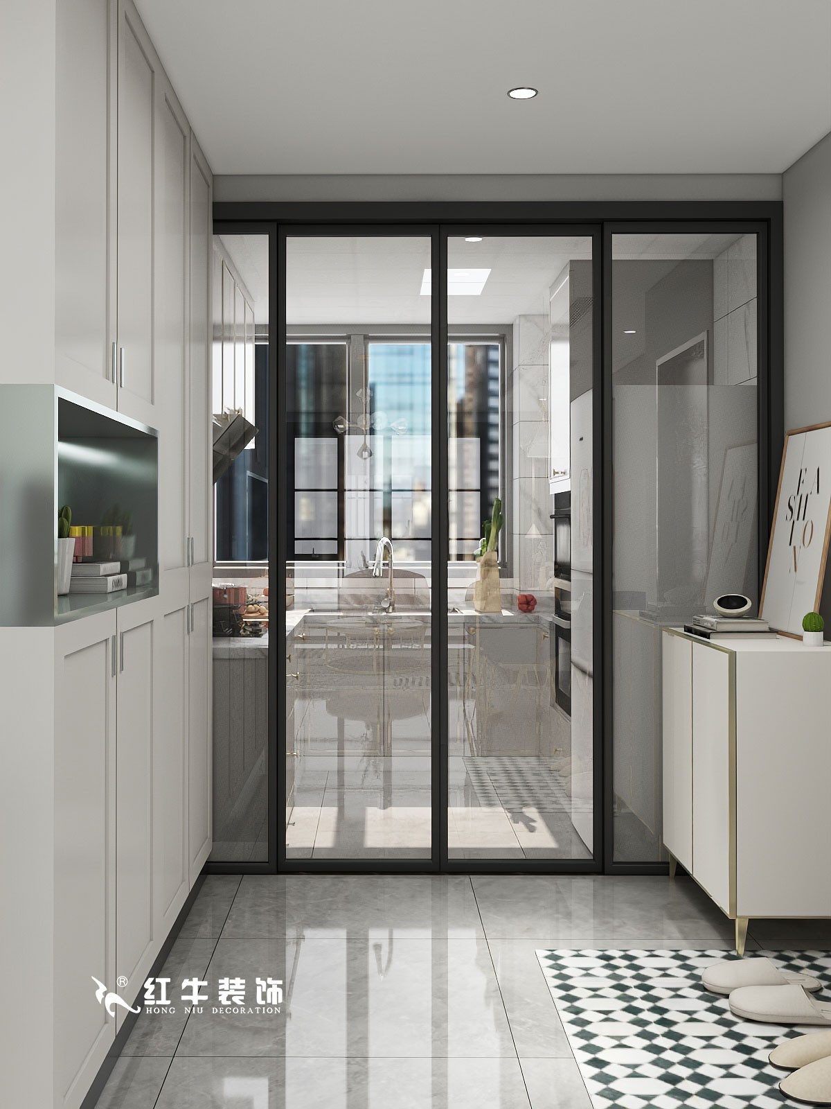 廚房選用了玻璃推門(mén),既能保障采光,也能防止油煙外泄,還不會(huì)給人帶來(lái)的隔斷感。廚房?jī)?nèi)部是嵌入式設(shè)計(jì),把家電嵌入到櫥柜中,家電的排列組合會(huì)更加科學(xué),整個(gè)空間看起來(lái)非常清爽。