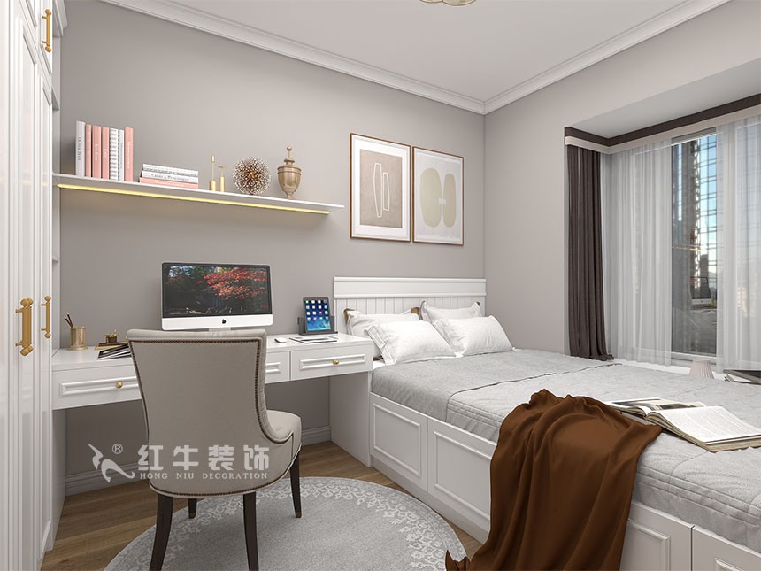 整體風(fēng)格簡約,白色和木紋色營造出溫馨的生活氣息,次臥室設(shè)計了組合柜,既有學(xué)習(xí)的區(qū)域同時也兼顧了休閑空間。
