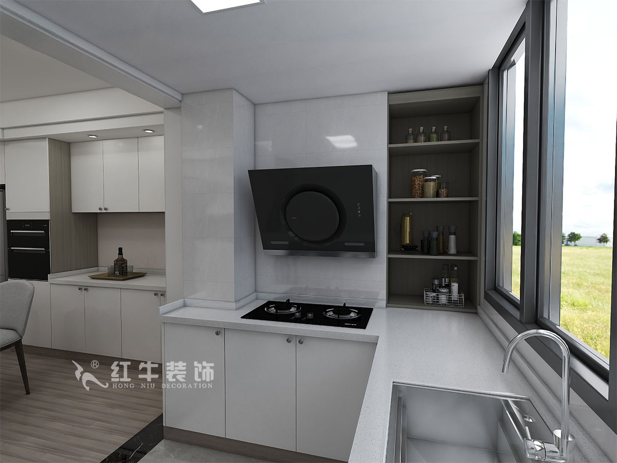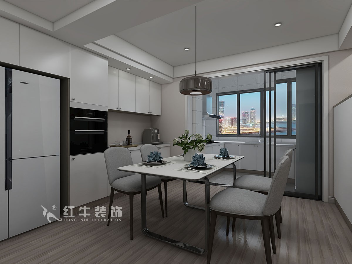 樓下的客戶(hù)挪到了餐廳陽(yáng)臺(tái)的位置,這樣餐廳的位置就變得很大,這個(gè)戶(hù)型的墻體有點(diǎn)異型,利用柜子把空間做方正,增加了儲(chǔ)藏的空間,客廳和餐廳中間做了半高墻體,客餐廳空間視覺(jué)連通,空間感覺(jué)也更大。
