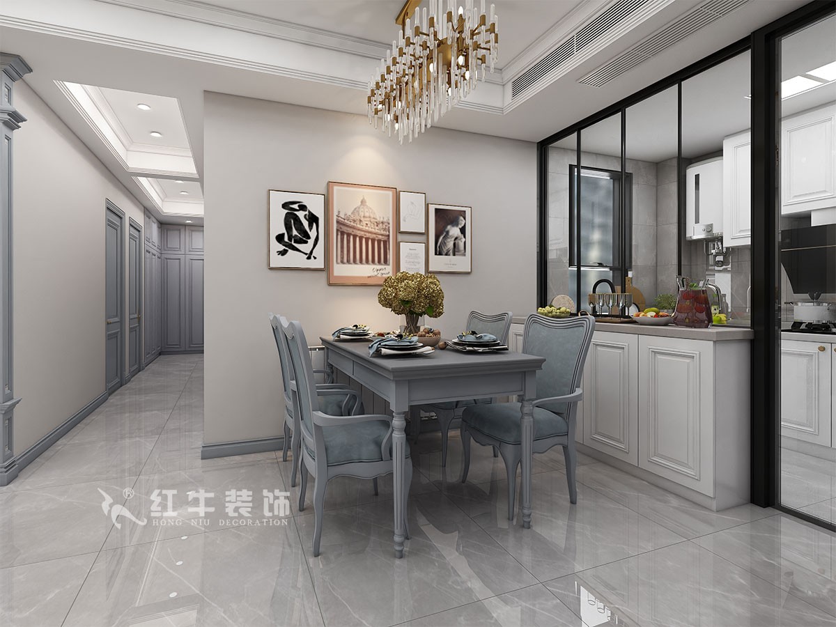 客餐廳的設(shè)計(jì)上,設(shè)計(jì)師在設(shè)計(jì)時(shí)希望能利用石材、軟包、木質(zhì)線條、金屬、玻璃所表現(xiàn)出的質(zhì)感,使其完美的呈現(xiàn)出現(xiàn)代時(shí)尚的裝飾美感。結(jié)合業(yè)主對(duì)于冷色調(diào)的喜愛,硬裝部分選擇了天藍(lán)色作為基調(diào),而軟裝部分使用墨綠色和米白色點(diǎn)綴,并選擇全屋淺灰色墻布融合整個(gè)客餐廳設(shè)計(jì),軟裝設(shè)計(jì)搭配上使用水晶吊燈、金屬臺(tái)燈和金屬飾品,讓客餐廳顯得舒適協(xié)調(diào)。
