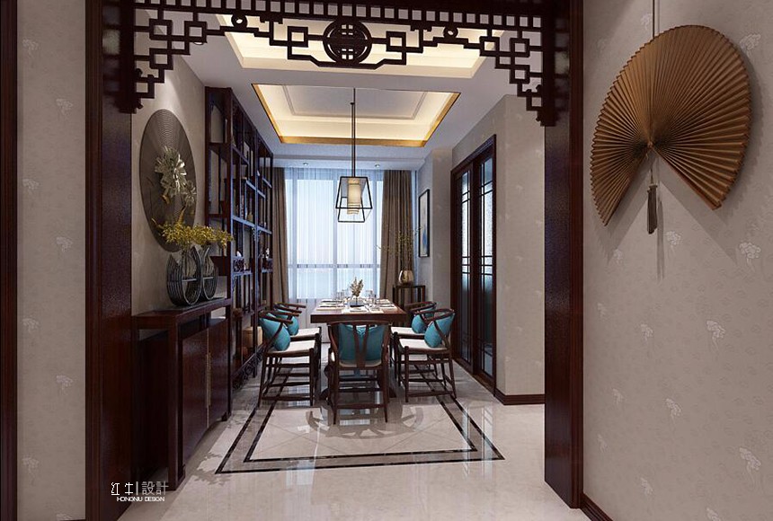 本案設(shè)計(jì)使用了中式的屏風(fēng)或窗欞、中式木門(mén)、簡(jiǎn)化的中式博古架等。通過(guò)這種新的分隔方式展示出中式家具的層次之美。再配一些簡(jiǎn)約的造型為基礎(chǔ),添加了中式元素,使整個(gè)空間更加豐富,